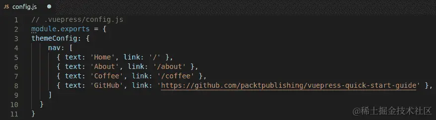 您还可以选择从 npm 依赖项中使用自定义 VuePress 主题。在这种情况下,您需要在config.js文件中使用主题配置选项。只需将以下代码添加到您的.vuepress/config.js文件中: