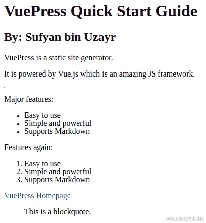 VuePress 自称为“Vue 动力的静态站点生成器”。换句话说,VuePress 是一个简单的工具,可以让您在几分钟内创建静态站点和单页应用(SPA)。