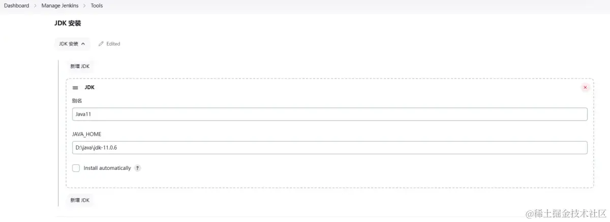 在 [Dashboard]> [Manage Jenkins] > [Tools]页面 【JDK安装】新增JDK;【Git installations】下Add Git。如下图