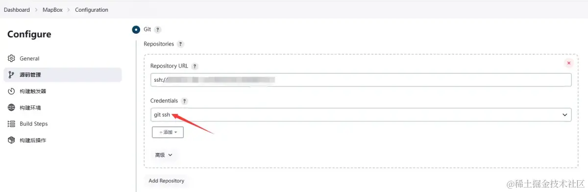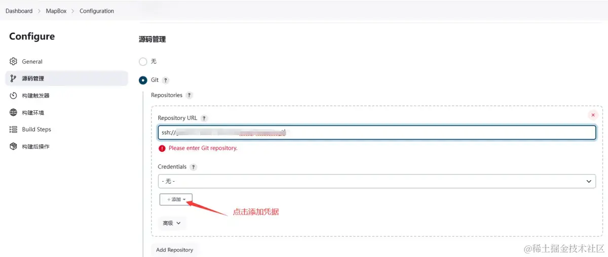 在【源码管理】下选中 Git,在Repository URL 填入仓库地址,在Credentials下添加凭据,如果仓库是使用SSH的话添加ssh私钥,如果是http的话添加用户名密码。