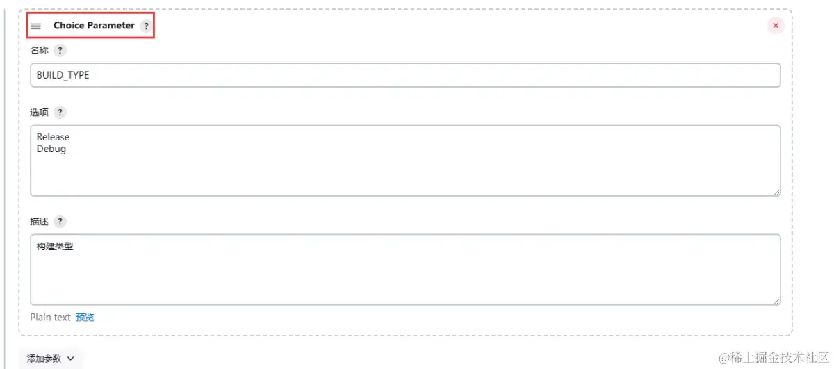 下面截图里增加了个参数 BUILD_TYPE,是个选择类型参数,增加了Release和Debug两个选项。添加其他类型的参数大家可以自己试试。