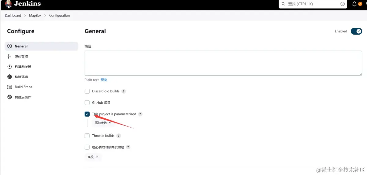 如果构建时需要传参,选中【This project is parameterized】后添加参数。