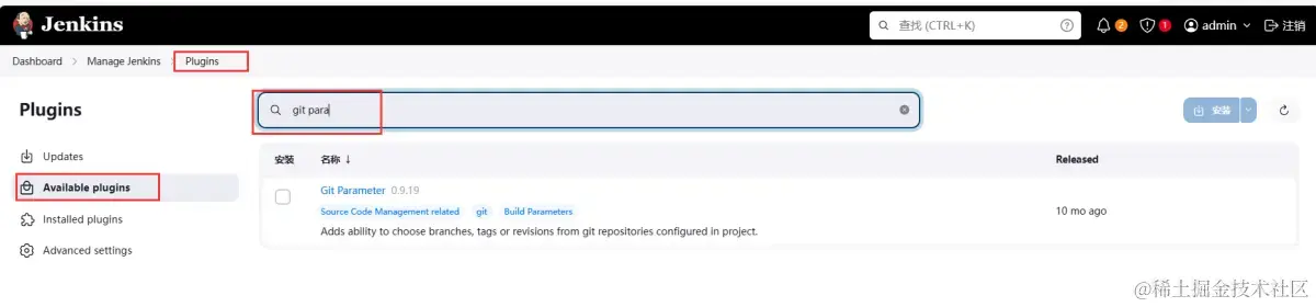 在 [Dashboard]> [Manage Jenkins] > [Plugins]页面 搜索插件名称,选中并点击安装。image.png