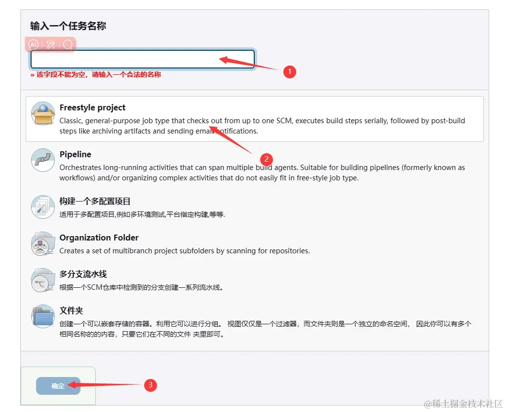 点击【新建item】,输入任务的名称,选中【Freestyle project】,点击确定完成创建。