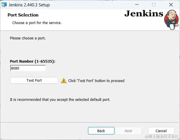 安装时可在这边修改端口,默认是8080。点击Test Port按钮可以测试当前端口是否可用。