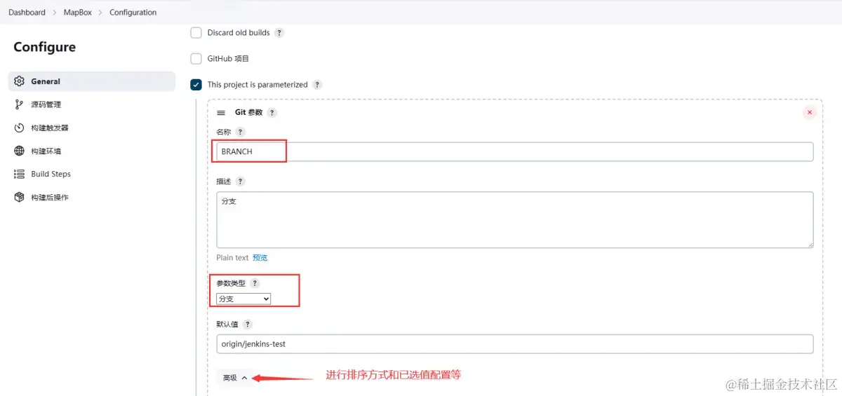 安装完成后回到项目配置页,添加参数,选中【Git参数】,填写名称、描述和默认值,选择参数类型,这边选择“分支”,按需求也可以选标签等其他选项。点击高级 按钮可去配置排序方式和已选值等。