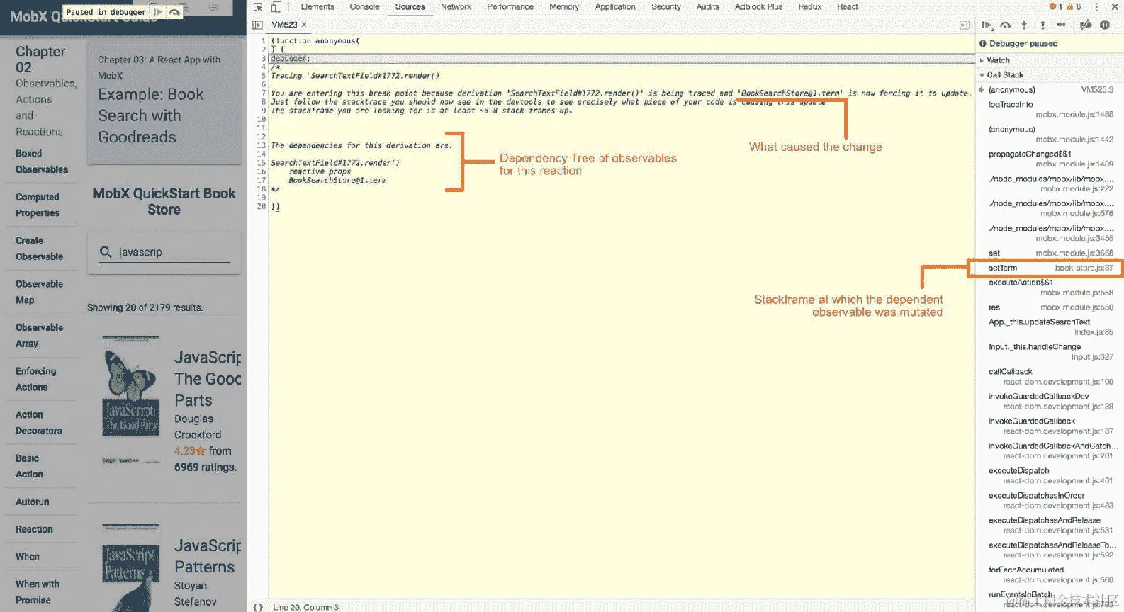 通常会使用trace(true)来调用跟踪,这将在调用时暂停在调试器内。对于书搜索示例(来自第三章,使用 MobX 的 React 应用),我们可以直接在SearchTextField组件的render()内放置一个跟踪语句: