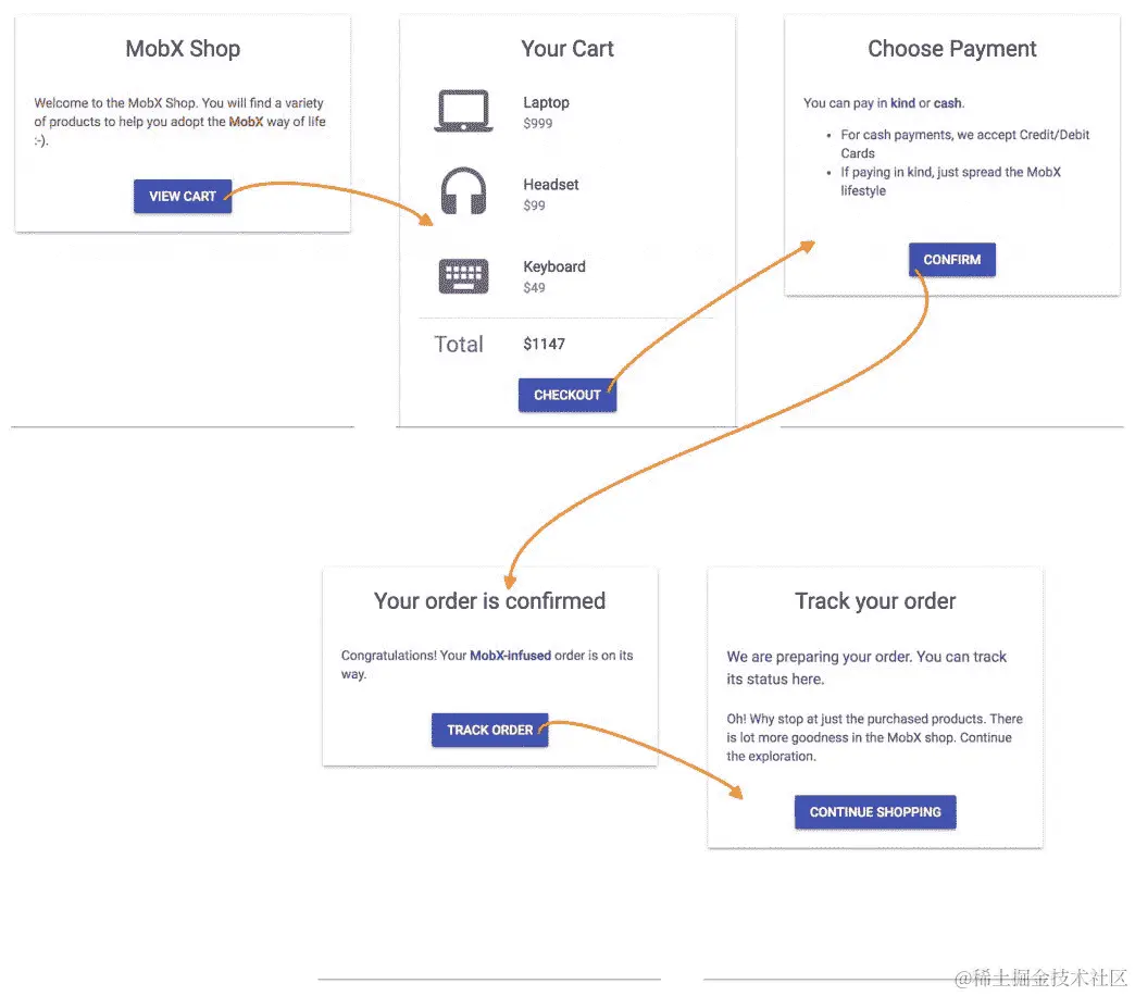 spy()和trace()在调试期间是您的朋友,并与mobx-react-devtools配合使用,您可以获得一个用于识别和改进渲染性能的可视化调试器。这些工具和实用程序为您提供了丰富的开发人员体验(DX),在使用 MobX 时非常有用。