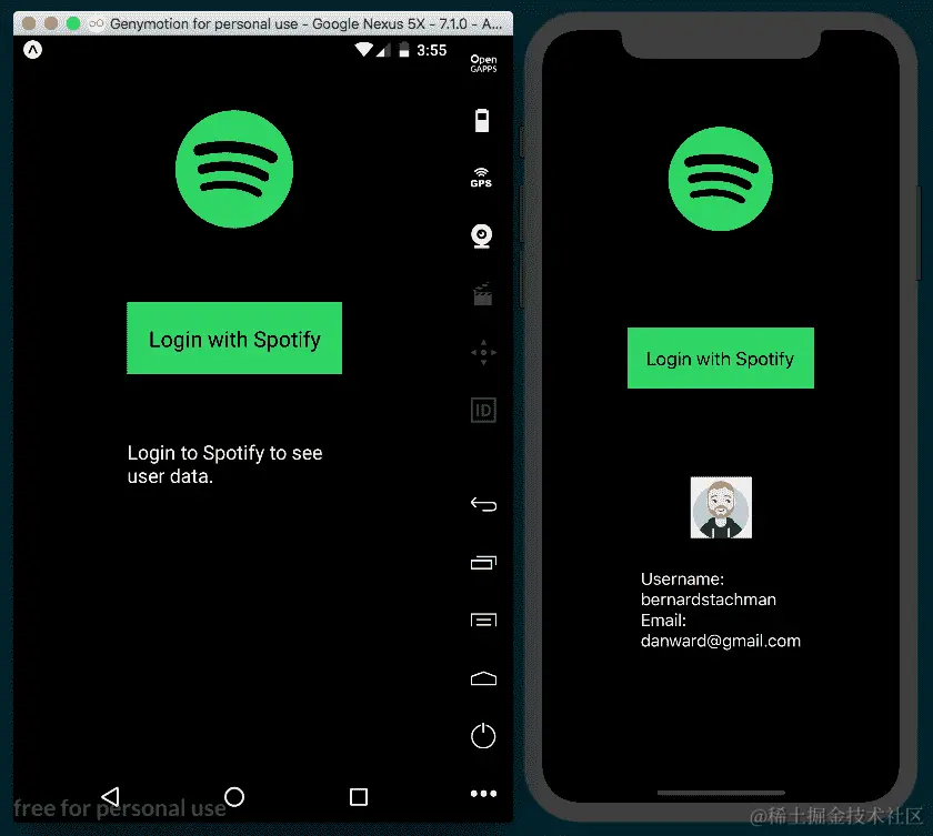 在步骤 5中,我们完成了 Spotify 登录处理程序。如果登录不成功,我们相应地更新了state上的didError。如果成功,我们使用该响应访问 Spotify API 端点以获取用户数据(api.spotify.com/v1/me)。我们根据 Spotify 的文档,使用Bearer ${results.params.access_token}定义了GET请求的Authorization标头来验证请求。在此请求成功后,我们将返回的用户数据存储在userInfo state对象中,这将重新呈现 UI 并显示用户信息。