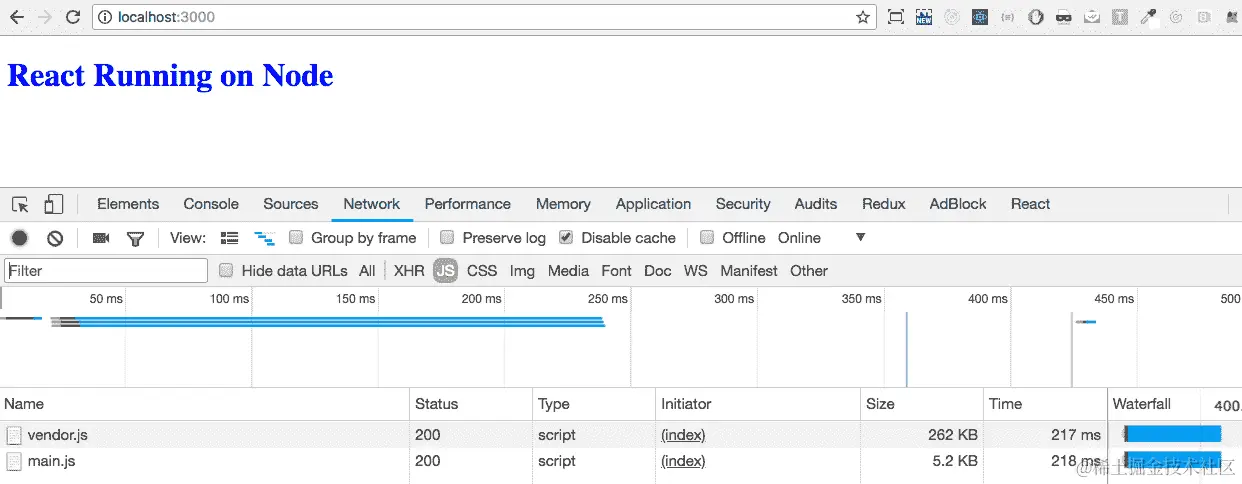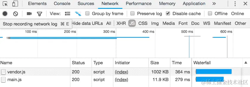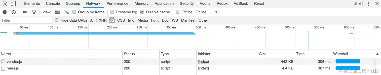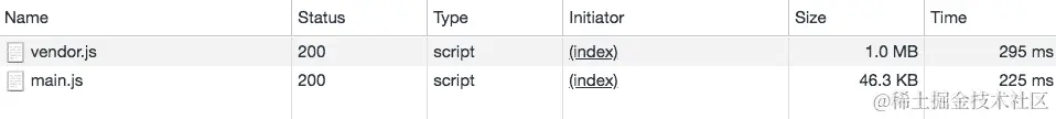 - 如您在控制台中所见,HMR 指定每个事件的发生并为您提供更新的模块。如果您打开网络选项卡,您将看到我们捆绑包的巨大大小(vendor.js = 1MB和main.js = 46.3KB):
