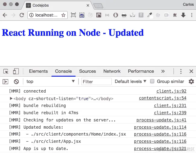webpack-hot-middleware添加一个条目,并为react-hot-loader添加一个条目来连接到HMR(热模块替换):