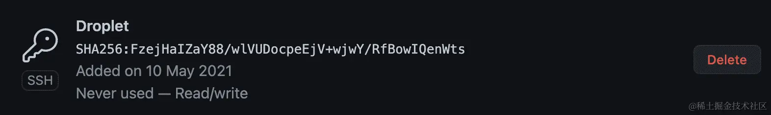 - 点击“添加 SSH 密钥”按钮后,您将看到您的 SSH 密钥,如下所示: