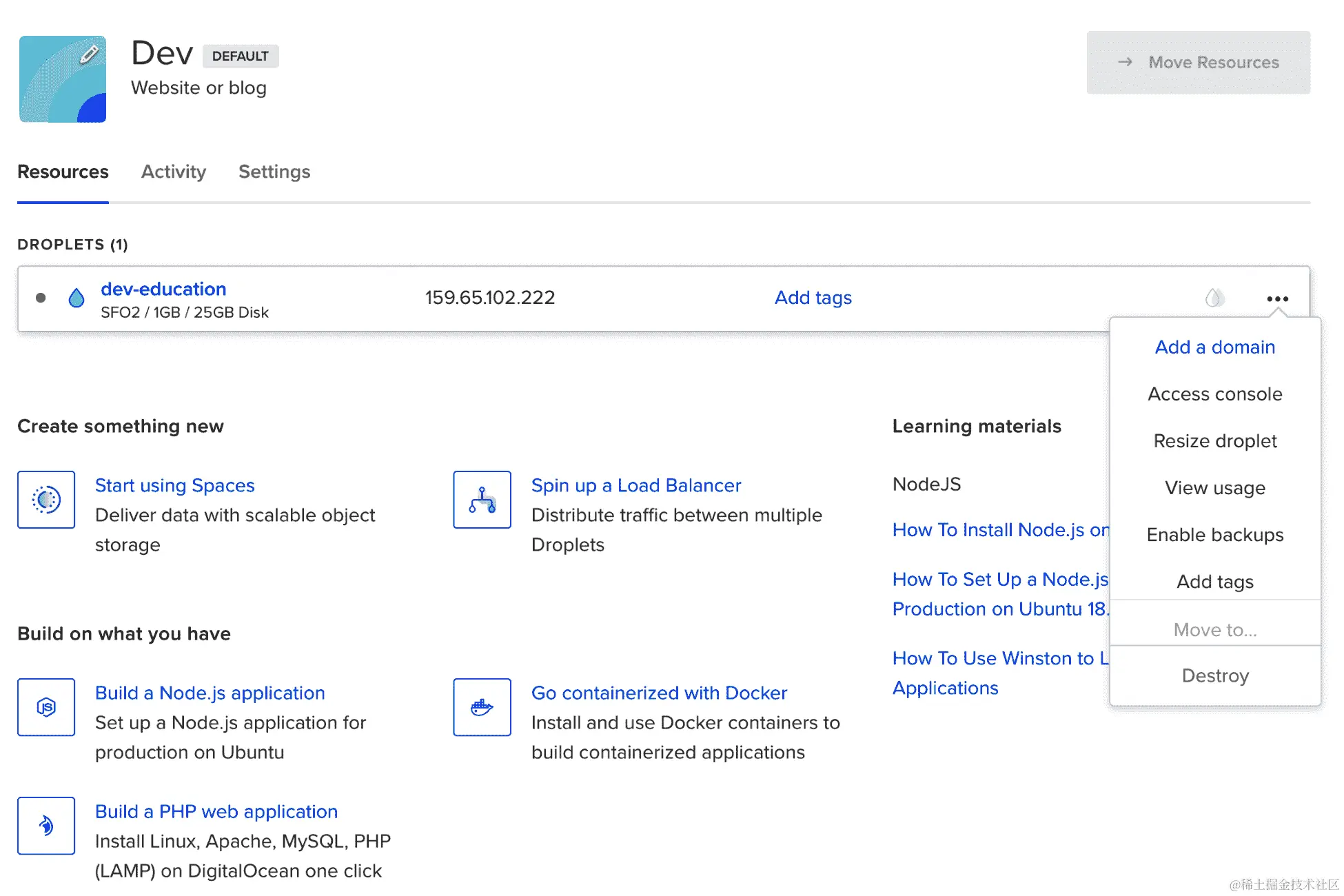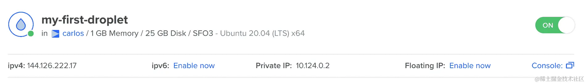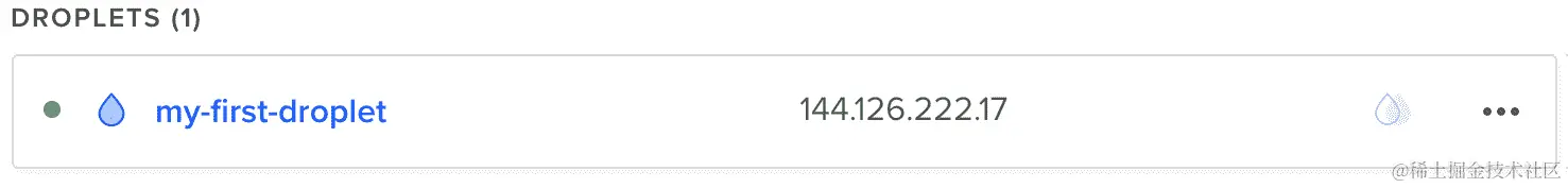 - 创建 Droplet 大约需要 30 秒。创建完成后,您将能够看到它: