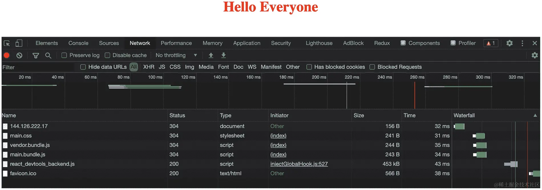 - 如果运行它并在 Chrome DevTools 的网络选项卡中查看,您将看到加载的捆绑包: