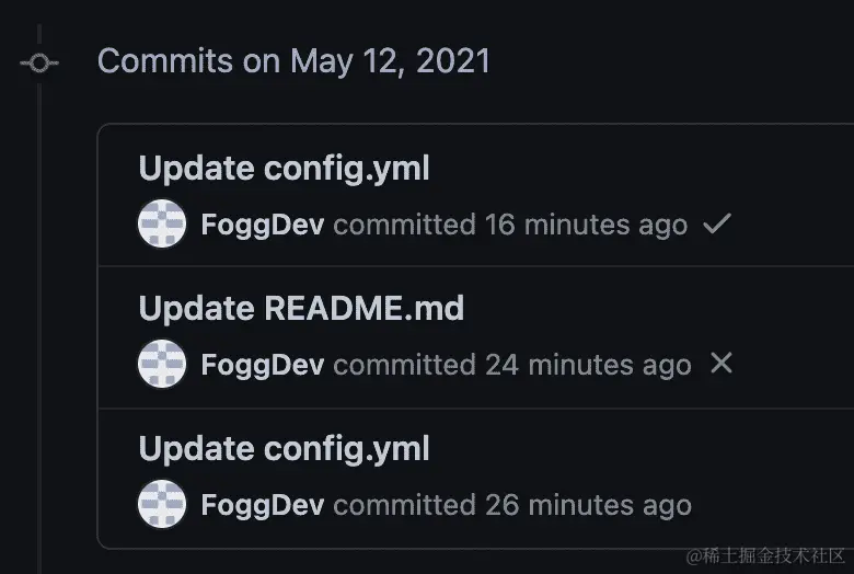 另一个很酷的事情是,如果您现在转到 GitHub 存储库并检查您的提交,您将看到所有成功构建的提交和所有失败构建的提交。