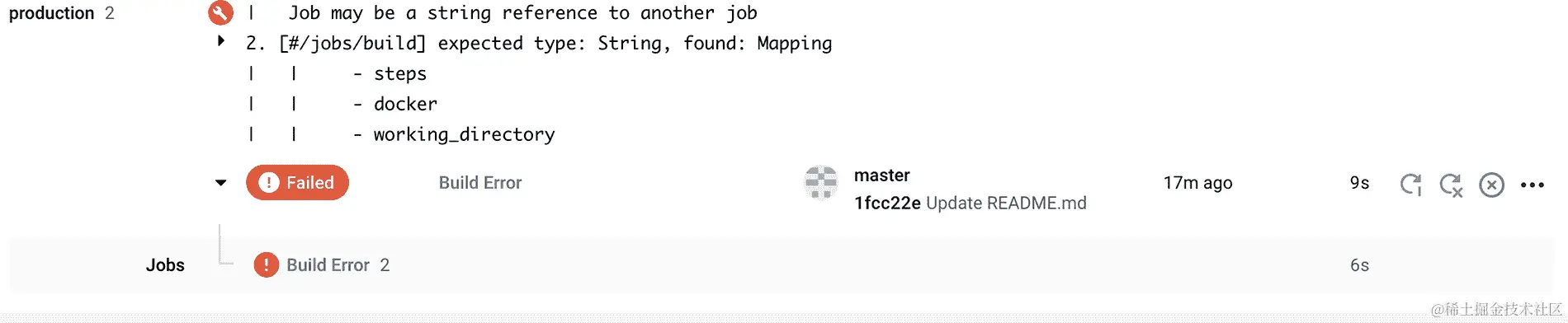 通常,前两个或三个构建可能会因为语法错误、配置中的缩进错误,或者因为我们有 linter 错误或单元测试错误而失败。如果失败,您将看到类似于这样的内容: