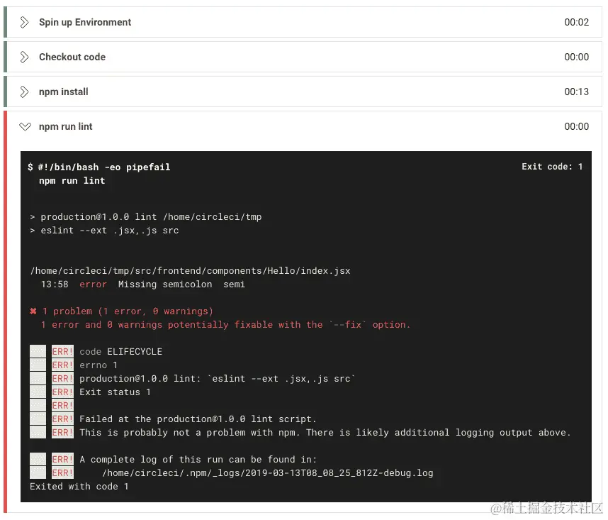 如您所见,一旦检测到错误,它将以代码1退出。这意味着它将中止部署并将其标记为失败,如您所见,在npm run lint之后的步骤都没有执行。