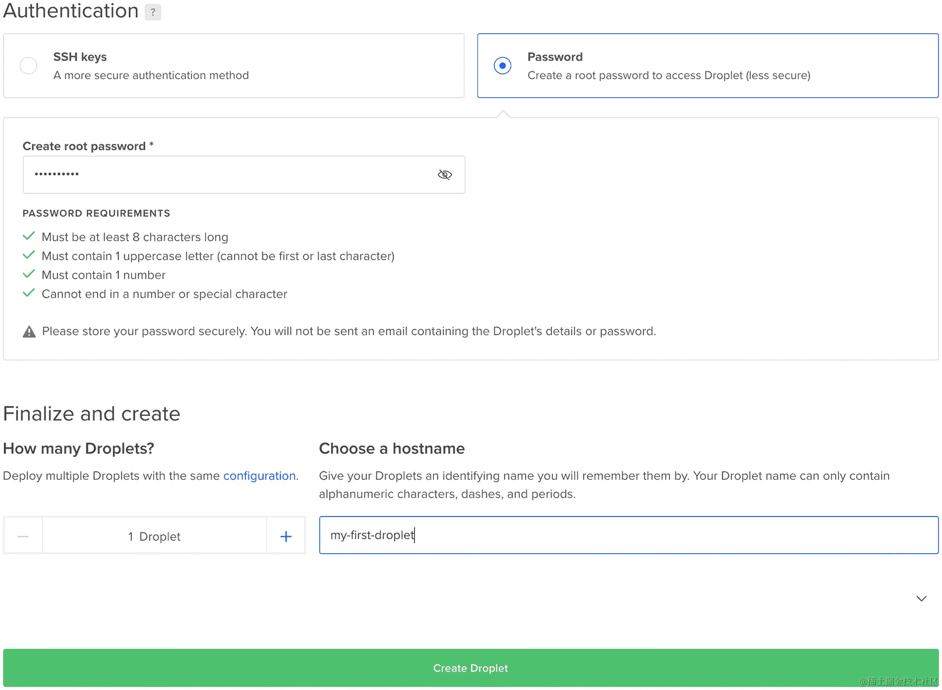 - 创建一个根密码,添加 Droplet 的名称,然后点击“Create Droplet”按钮,如下所示: