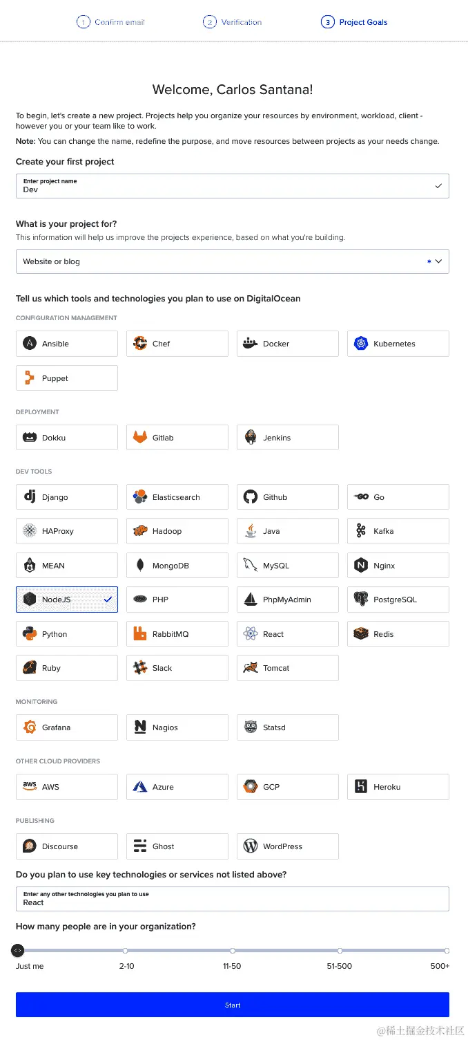 您可以使用信用卡支付,也可以使用 PayPal 支付。一旦您配置了付款信息,DigitalOcean 将要求您提供一些关于您的项目的信息,以便更快地配置您的 Droplet: