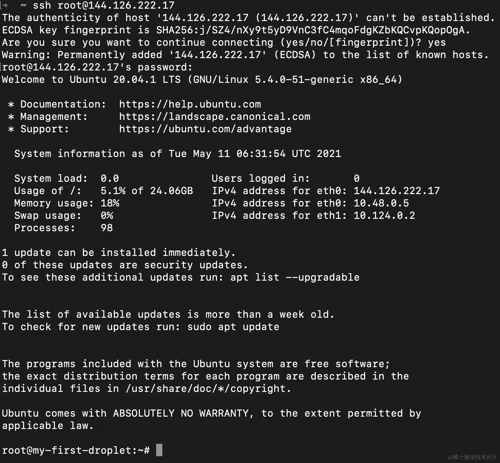 - 第一次访问时会要求输入指纹,只需输入 Yes,然后需要输入密码(创建 Droplet 时定义的密码)。