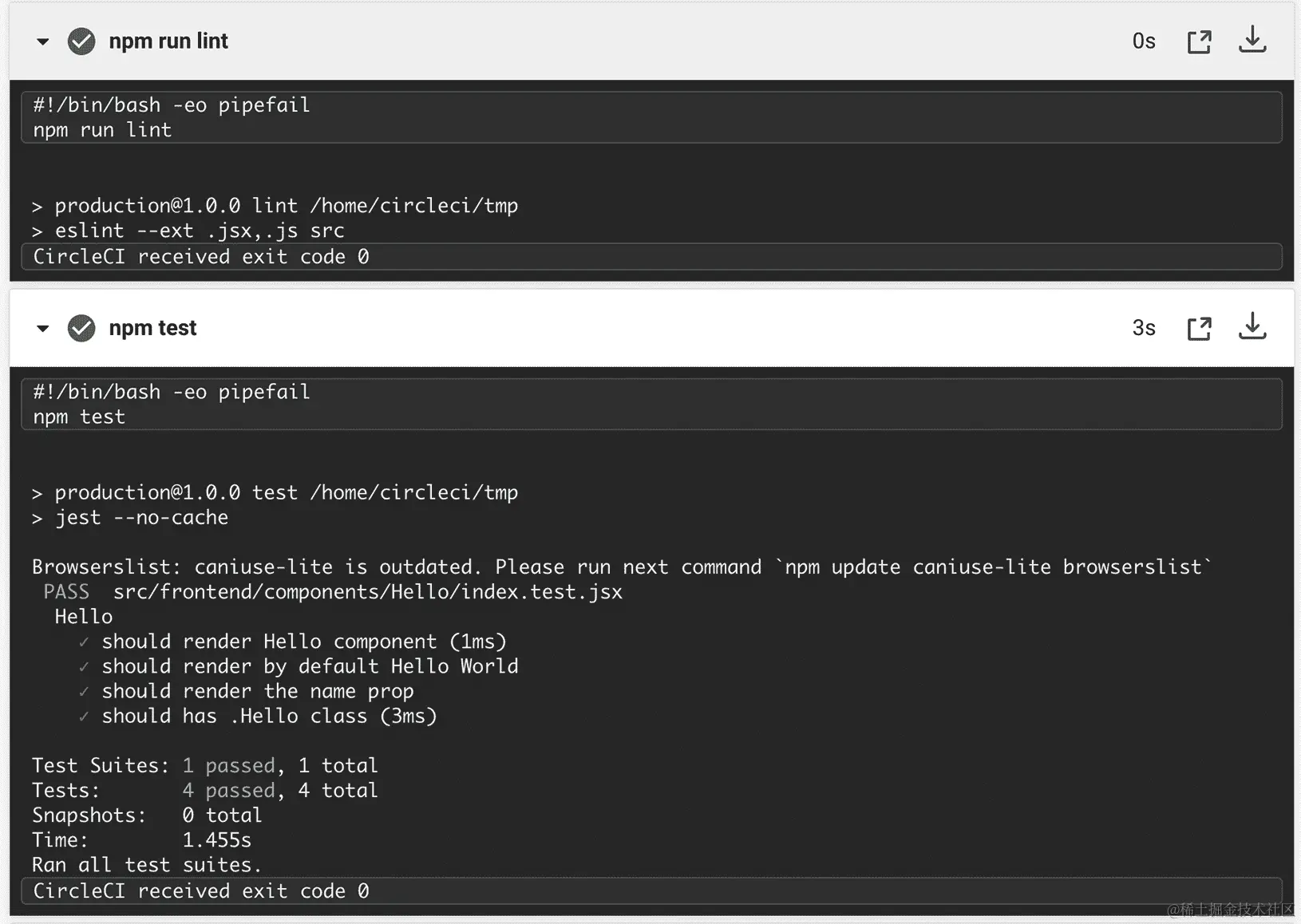 config.yml文件中的所有语法错误和 linter 或单元测试的所有问题后,您应该看到一个成功的构建,就像这样: