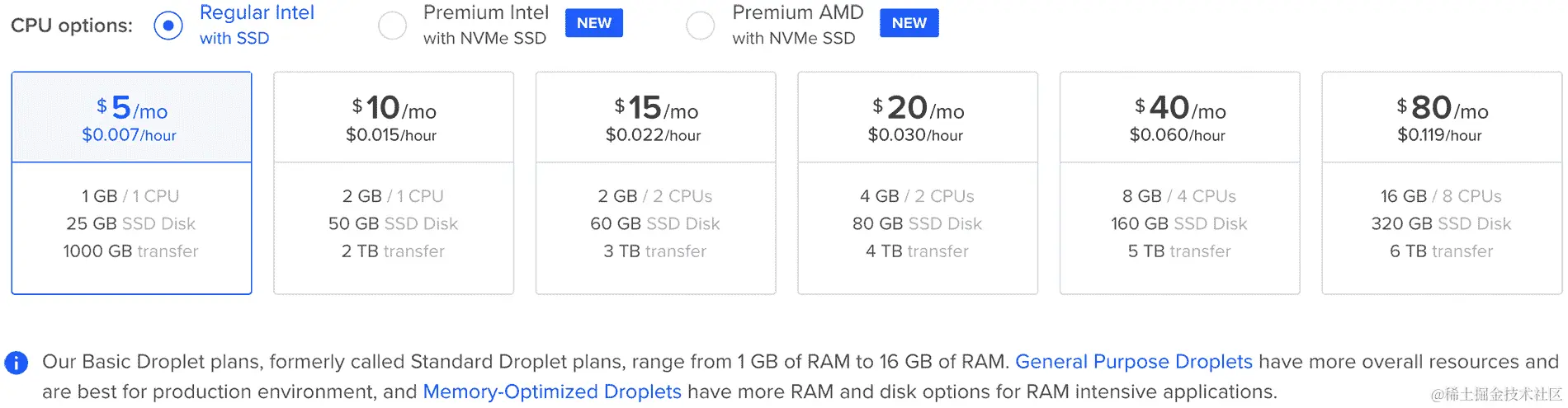 在这一点上,您需要投入一些资金来获得这项服务。我将向您展示最便宜的方法来做到这一点,如果将来您想增加 Droplets 的性能,您将能够在不重新配置的情况下增加容量。最基本的 Droplet 的最低价格是每月 5.00 美元(每小时 0.007 美元)。
