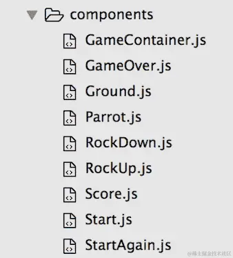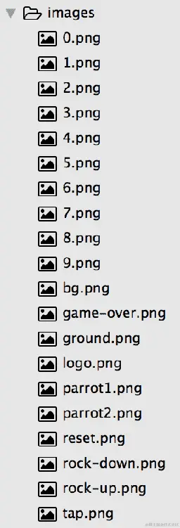 actions文件夹将只包含一个文件,因为在这个游戏中可能发生的只有三个动作(start,tick和bounce)。还有一个sounds文件夹,用于存储每次鹦鹉通过一对岩石时播放的音效: