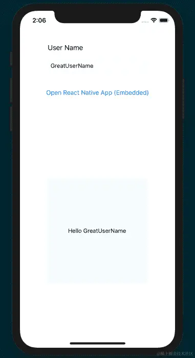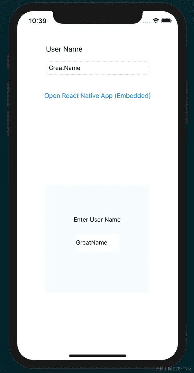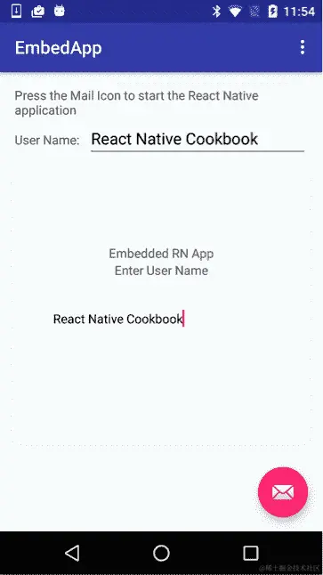 - 现在,如果您运行应用程序,您可以在“用户名”字段中输入文本,并启动 React Native 应用程序: