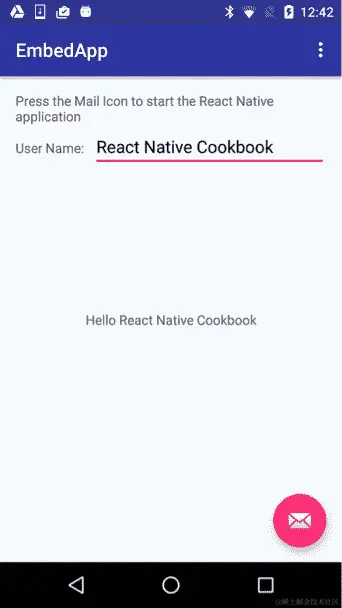 - 运行应用程序,启动 React Native 嵌入式应用程序,并向文本字段添加文本,您应该看到类似于以下截图所示的内容: