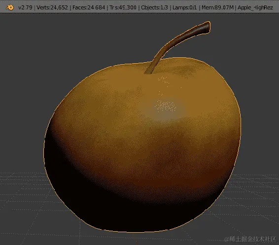 这与中等分辨率的苹果并没有太大的不同,尽管那些奇怪的纹理线已经消失了。看起来相当不错(这不是一个完整的细节渲染)。为了使分辨率更低的多边形,我在 Blender 中进行了快速的减面。减面是 Blender 的一种方式,可以将具有大量多边形的模型减少到更少的多边形,这是一种非常方便的方式,可以将非常复杂的模型制作成虚拟现实准备。手动进行减面,并对模型应用新的纹理,可能会消除接缝。