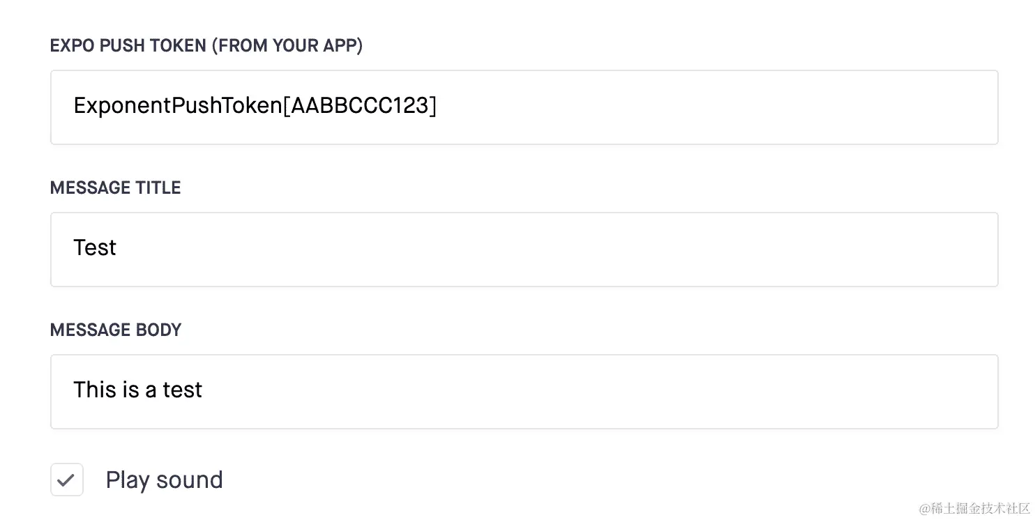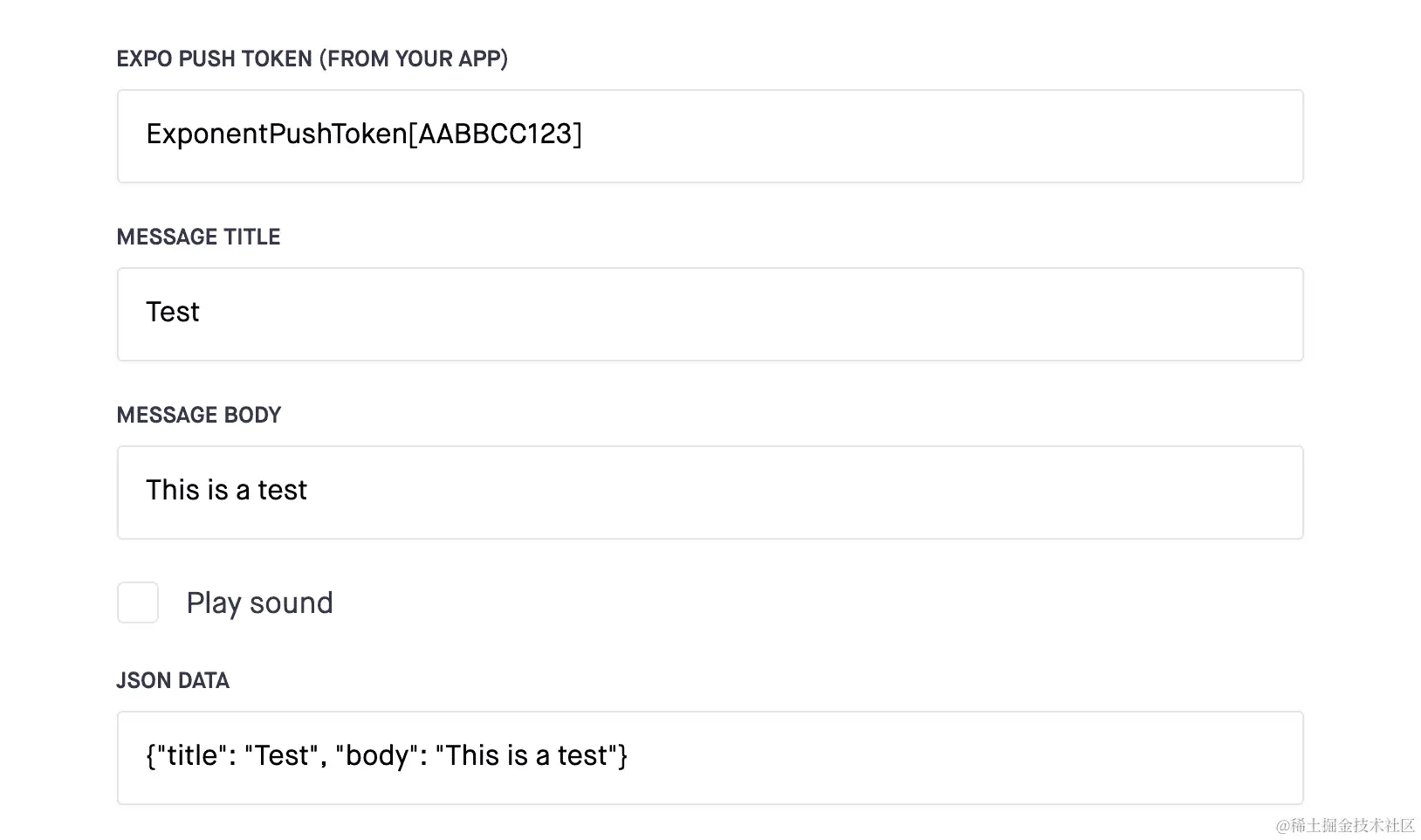 NotificationsAPI,handleNotification函数可以访问发送的通知中的数据对象。该数据对象与您使用 Expo 仪表板发送的消息标题和消息正文不同,因此在从https://expo.io/dashboard/notifications发送通知时,您还需要添加 JSON 数据。可以通过在表单中添加正文来发送测试通知: