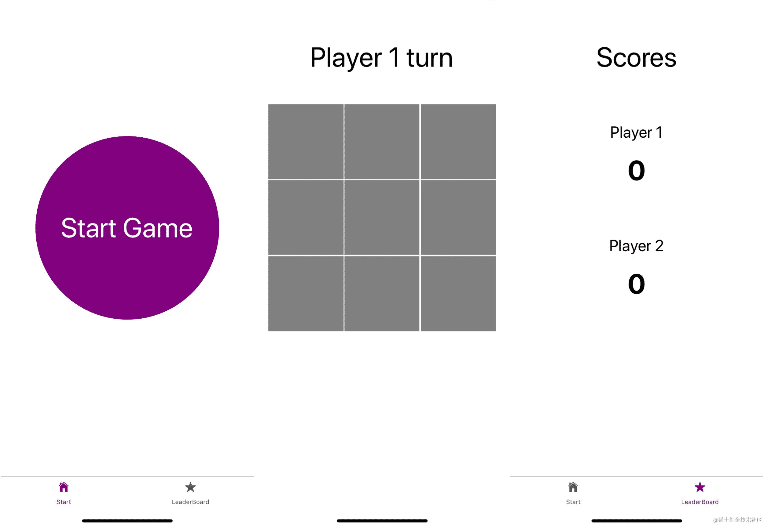 该应用程序由三个屏幕组成:Start,Game和LeaderBoard。第一个屏幕是Start,在那里可以通过点击绿色按钮开始游戏。这将导致Game屏幕,该屏幕设置为模态。Start屏幕使用选项卡导航,您还可以访问LeaderBoard屏幕,该屏幕将显示玩家的分数。