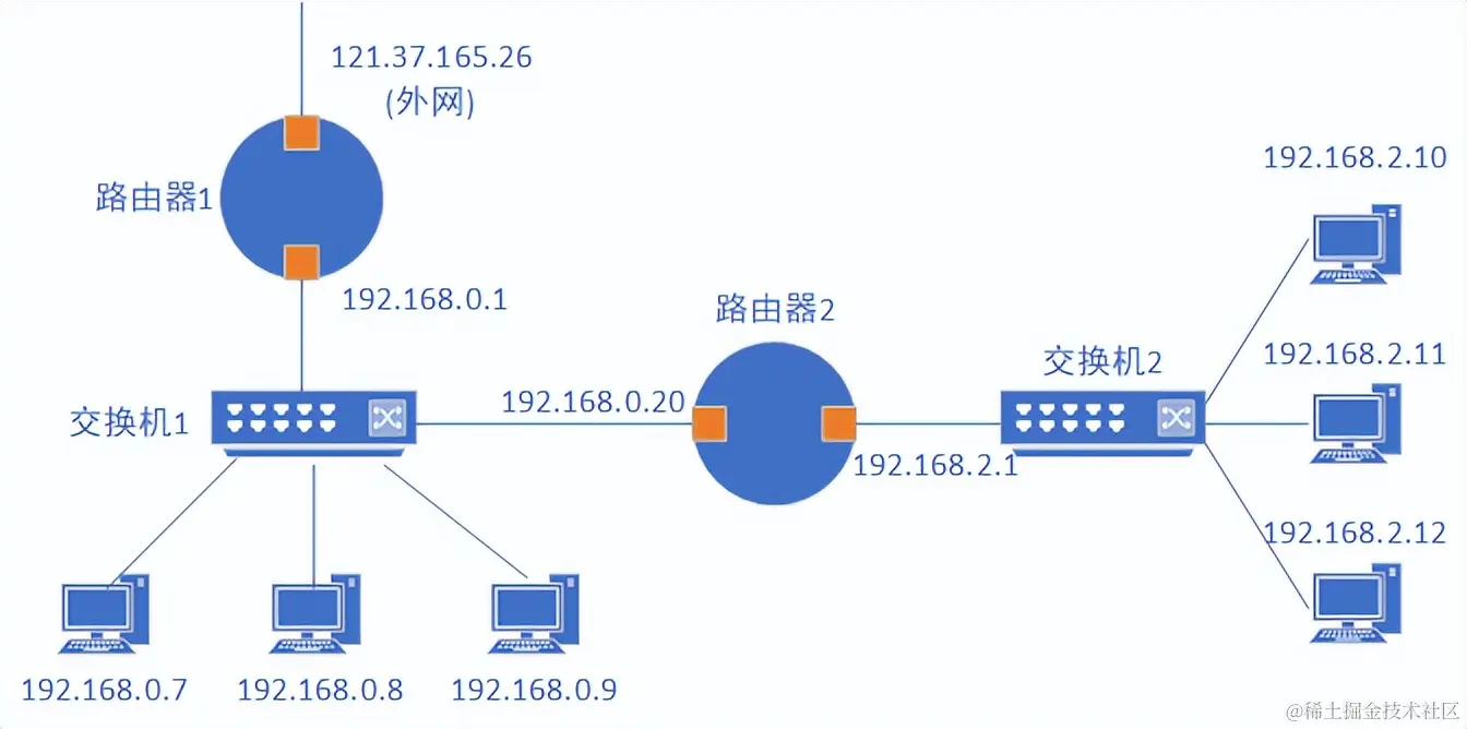 如下图所示有两个网络,分别是0网段和2网段,路由器1组成0网段,路由器2从路由器一种分出一个2网段