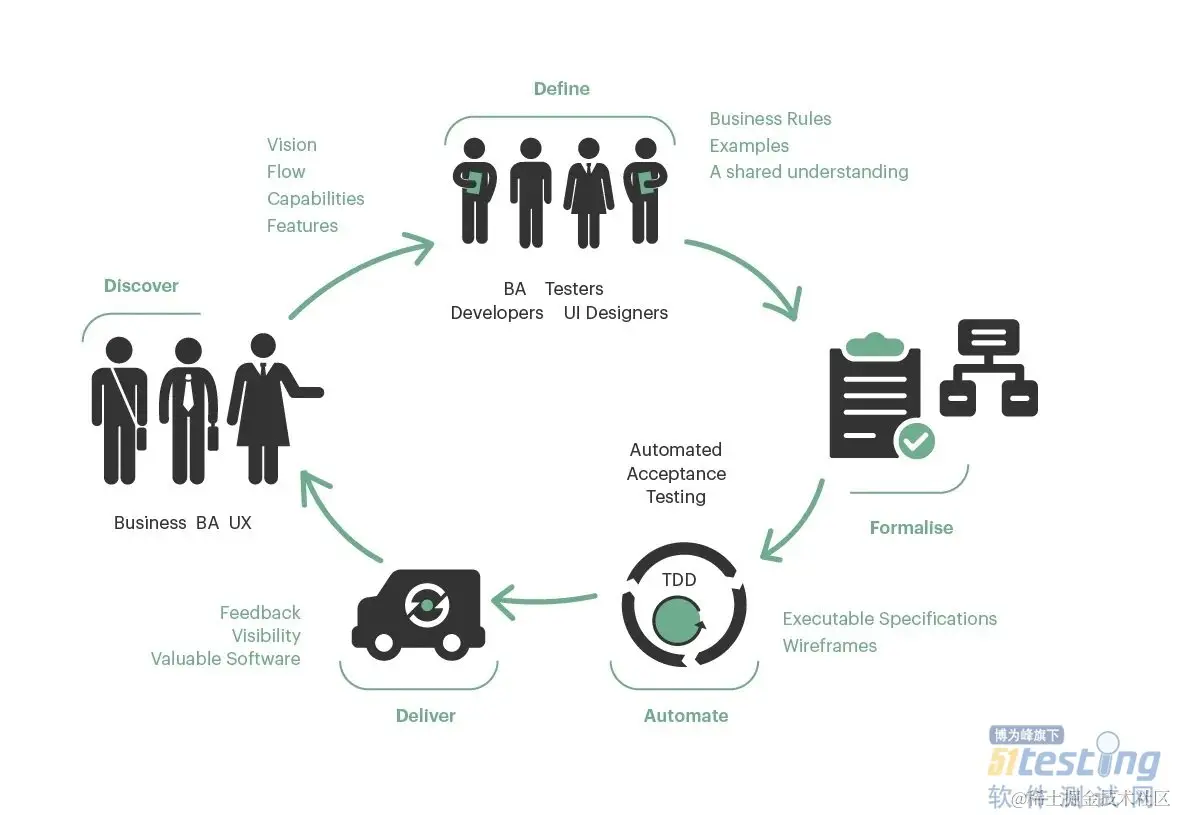 换多话来说,业务人员、测试人员、客户等利益相关者,以习惯的方式编写相关的测试用例,再由开发人员去实现相关的测试。如下图所示: