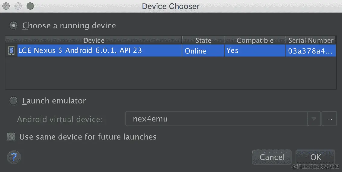 - 确保选择“选择运行设备”单选按钮,并且您的设备显示在列表中。按 OK 继续,如下所示: