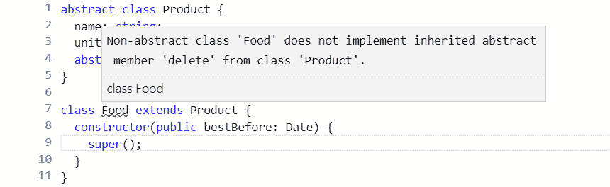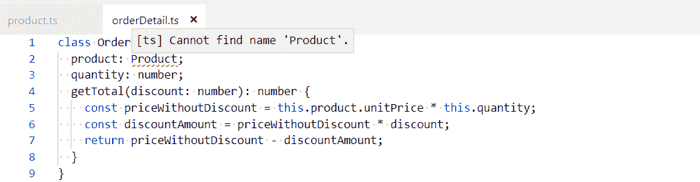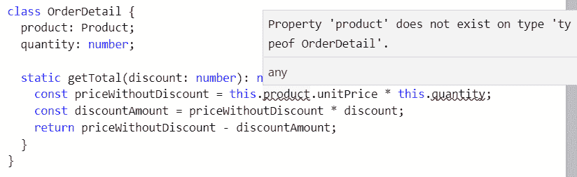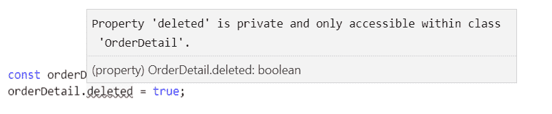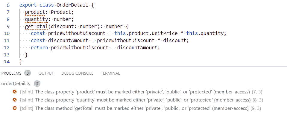 3. A full list of the rules can be found at: [`palantir.github.io/tslint/rules/`](https://palantir.github.io/tslint/rules/). The `member-access` rule forces us to explicitly declare the access modifier for classes. We haven't explicitly defined the property and method access modifiers in the `OrderDetail` class because they are `public` by default. So, with our linting rule in place, Visual Studio Code will highlight the lack of access modifiers to us: