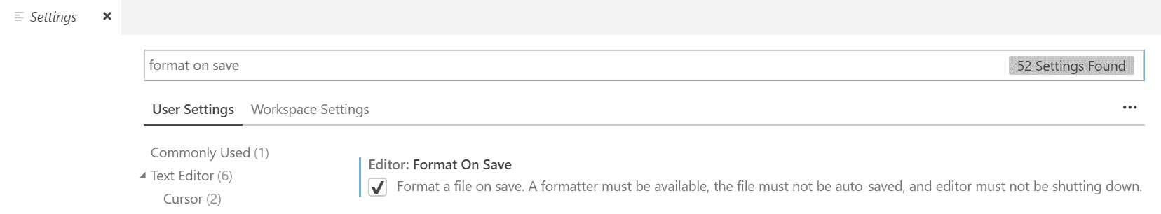 4. The last step is to make sure the Format on Save option is ticked in User Settings. Press *Ctrl* +*,* (comma) to open the settings screen and type Format On Save in the search box to find the setting. If the setting isn't ticked, then tick it: