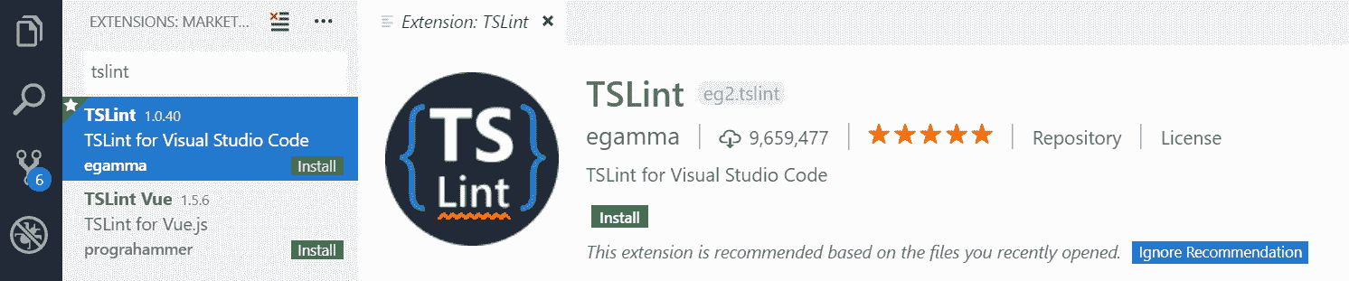 2. Now, we can open Visual Studio Code and go to the extensions area (*Ctrl + Shift + X*) and type `tslint` in the search box at the top-left. The extension is called TSLint and was published by egamma: