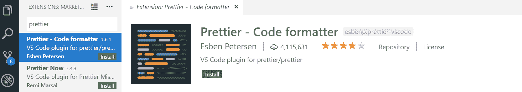 1. Let's open Visual Studio Code, go to the Extensions area, and type prettier in the search box. The extension is called Prettier - Code formatter and was published by Esben Petersen: