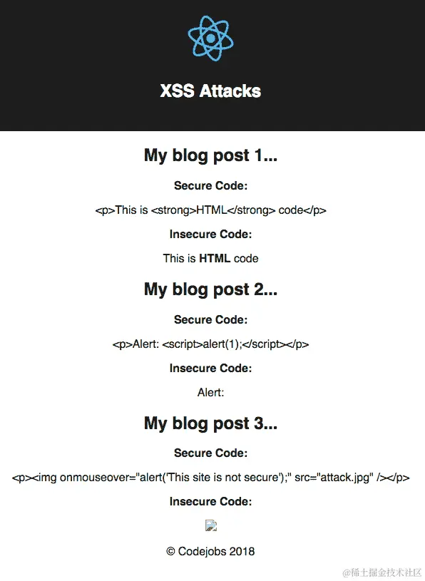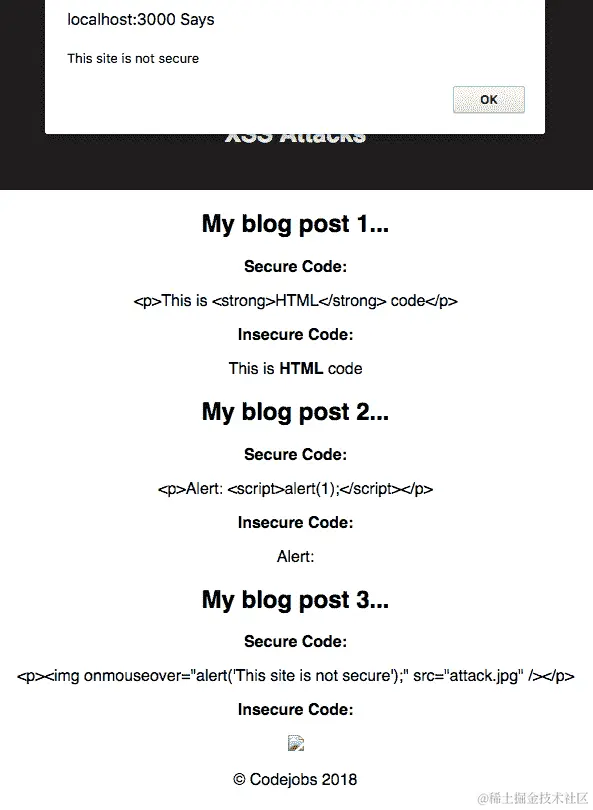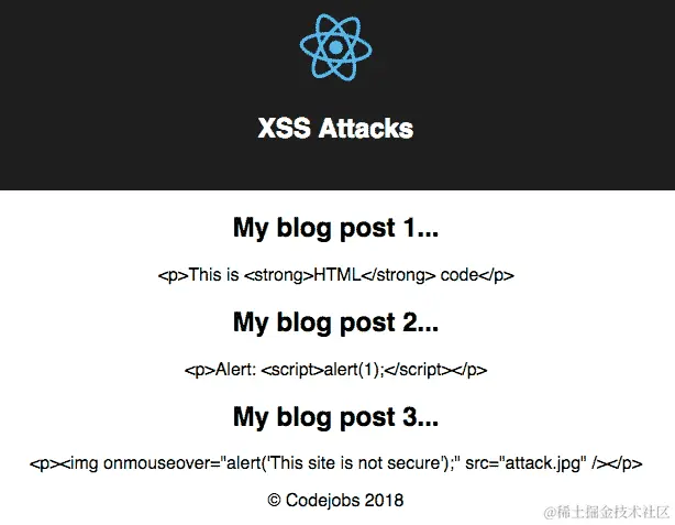 dangerouslySetInnerHTML,React 也会保护我们免受恶意脚本注入的影响,但这对我们来说还不够安全,我们不能放松对网站安全性的警惕。现在让我们看看“我的博客文章 3”的内容存在的问题。代码<img onmouseover="alert('This site is not secure');" src="attack.jpg" />并不直接使用<script>标签来注入恶意代码,而是使用了一个带有事件(onmouseover)的img标签。因此,如果您对 React 的保护感到满意,我们可以看到,如果我们将鼠标移到图像上,这个 XSS 攻击将被执行: