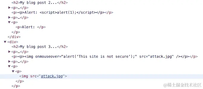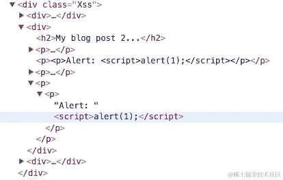 - 这很有趣,也许您认为“我的博客文章 2”的内容会在浏览器中触发警报,但实际上并没有。如果我们检查代码,警报脚本是存在的。