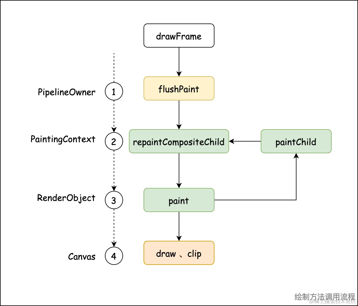 - 重绘时,与布局过程的 markNeedsLayout 相似,当 RenderObject 需要重绘时,会通过 markNeedsPaint 方法标记 dirty 节点存在PipelineOwner 中。