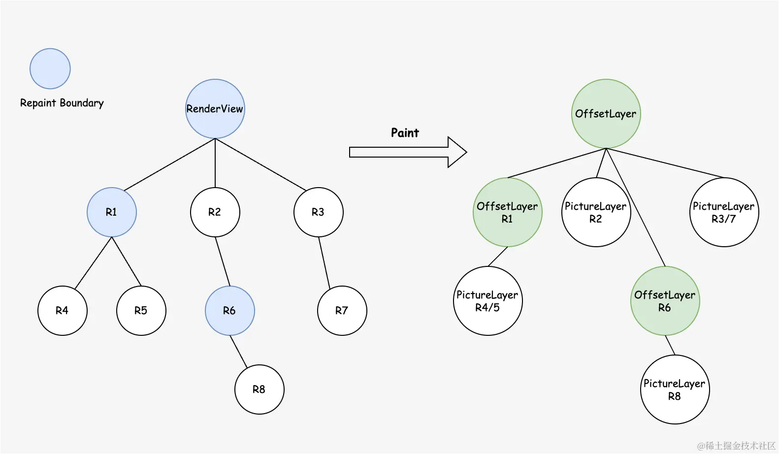 - 子节点R4不是边界节点且需要绘制,此时是第一次绘制,会创建对应的 PictureLayer 来承载绘制结果。并添加到边界节点的 OffsetLayer 中。