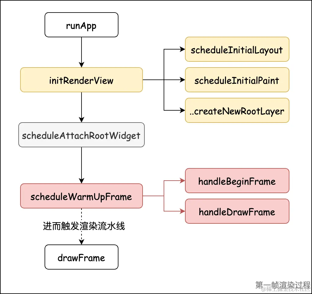 正如方法名,预热第一帧,在该方法内部直接调用了 handleBeginFrame()和handleDrawFrame(),强制渲染,从而触发渲染流水线。因此,Flutter 第一帧的绘制不需要等待 Vsync 信号驱动。
