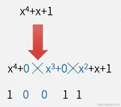 例:原始报文为“10111”,其生成多项式为:“G(X)=x4+x+1”。对其进行CRC编码后的结果为 1100