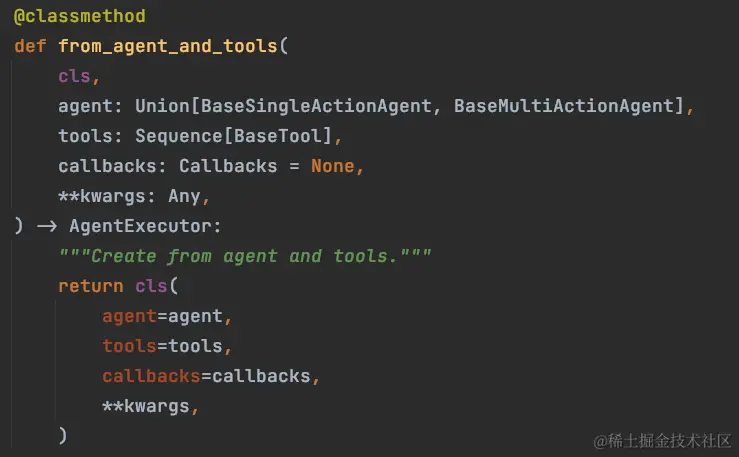 Agent.py ->from_agent_and_tools ,实例化方法是非常简单的,这里需要关注的是它的传入参数和工具相关的方法。
