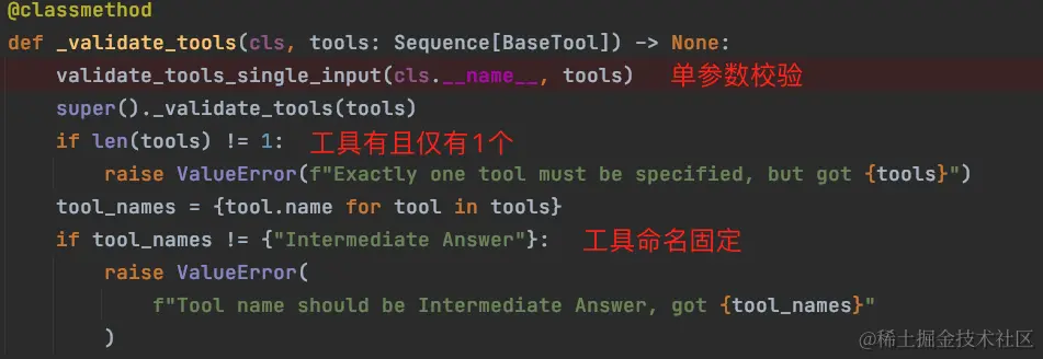 有的 Agent 比如 Self_ask,它要求工具必须是单参数,工具个数有且仅有 1 个,并且工具命名必须是"Intermediate Answer";当我们也有类似需求,则覆写父类的工具校验方法。