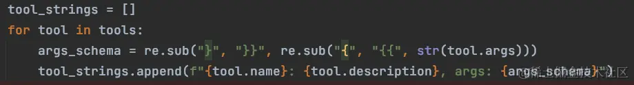 tool_strings 真实示例如下:可以看到除了工具的 name 和 description 外,里面还包含了参数列表的详细描述 args: