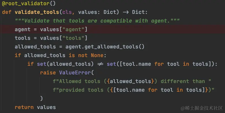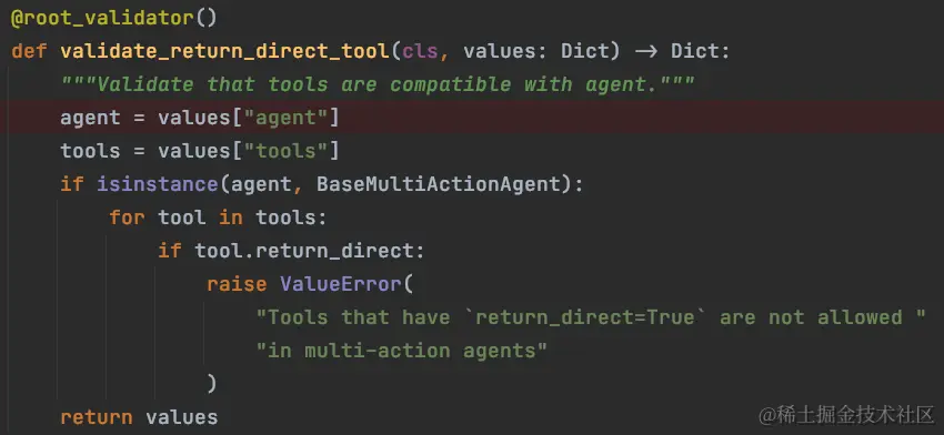 _validate_tools 方法,在当前 Agent 类型中,它直接使用了父类的检验逻辑,而父类中实际上没有实现对工具的检验逻辑,也就是说这个类型的Agent不校验工具;