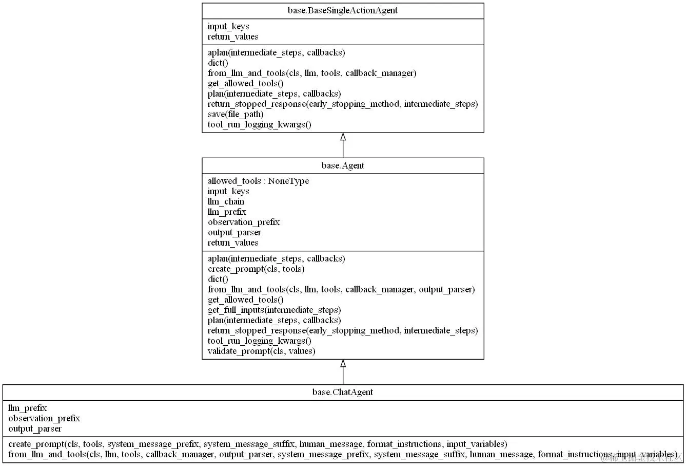 这里是拿 chat_agent 举例,实际上 LangChain 内置的 agent 继承关系几乎都是一样的,通过这个图我们也能很清楚地知道如果我们自己想自定义一个 Agent 应该如何去实现。